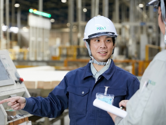 滋賀工場の横架材製造ラインに所属し、入社5年目でライン長となり、6年目からは構造材(横架材、柱材)の生産管理責任者を務めています。