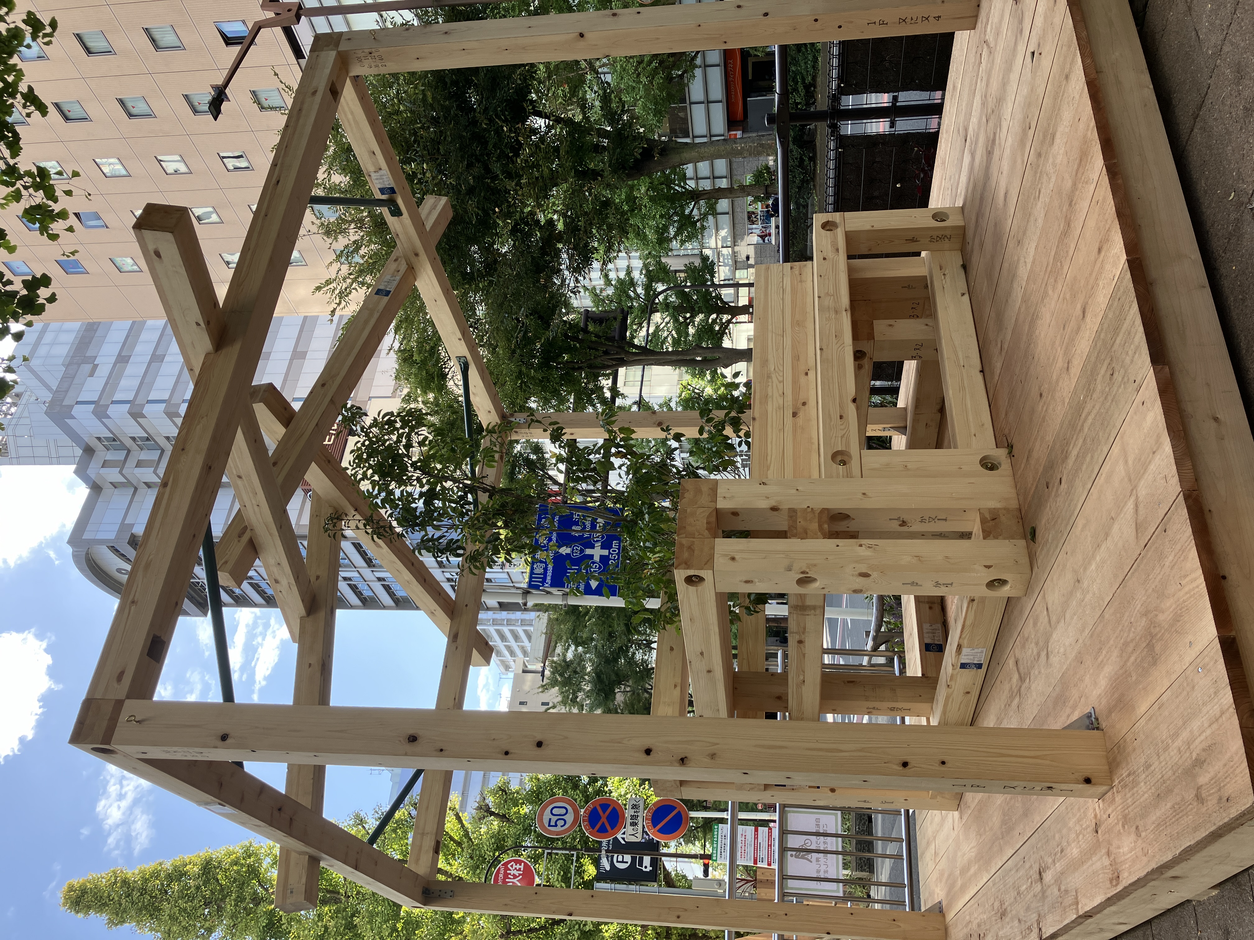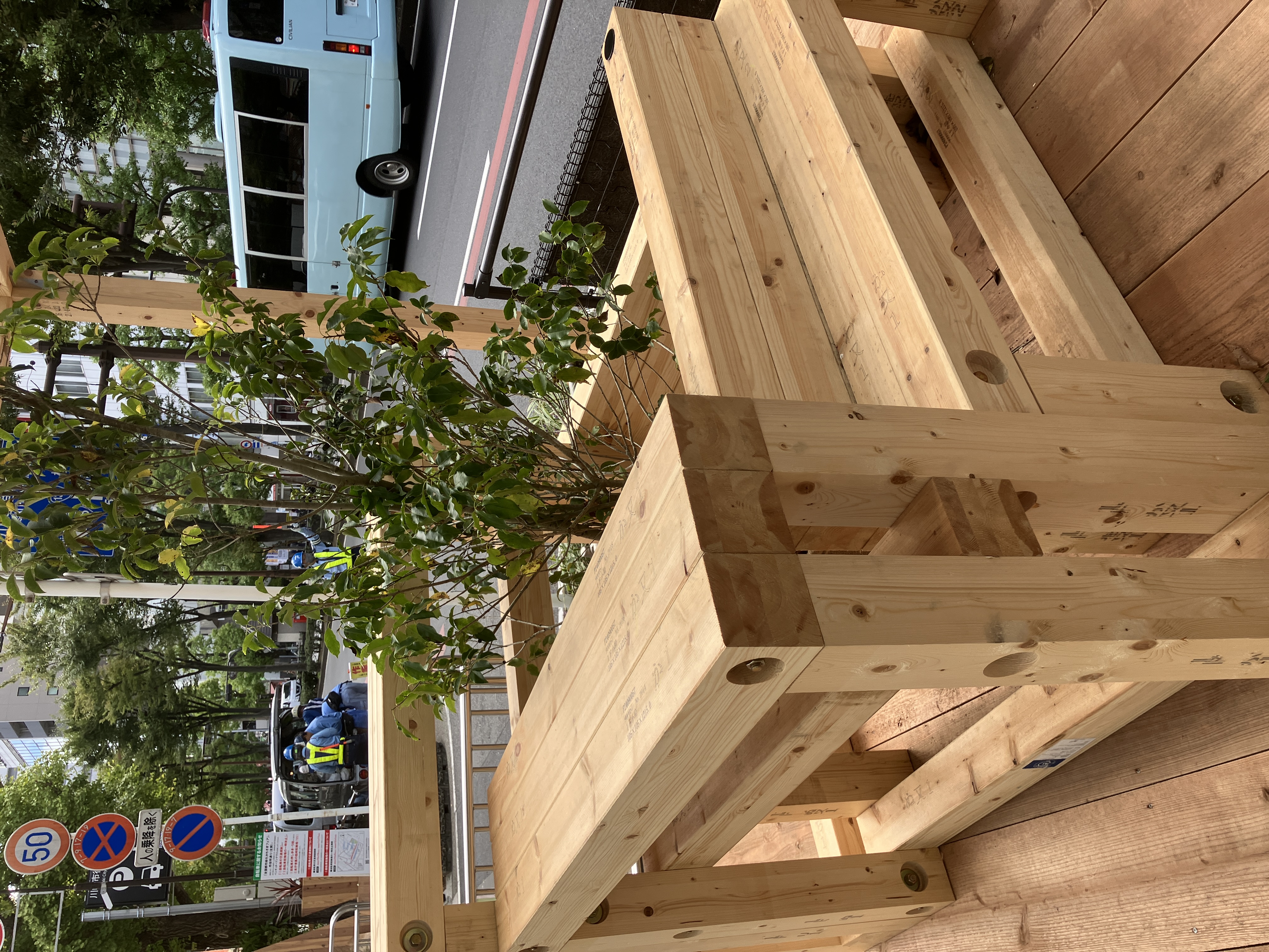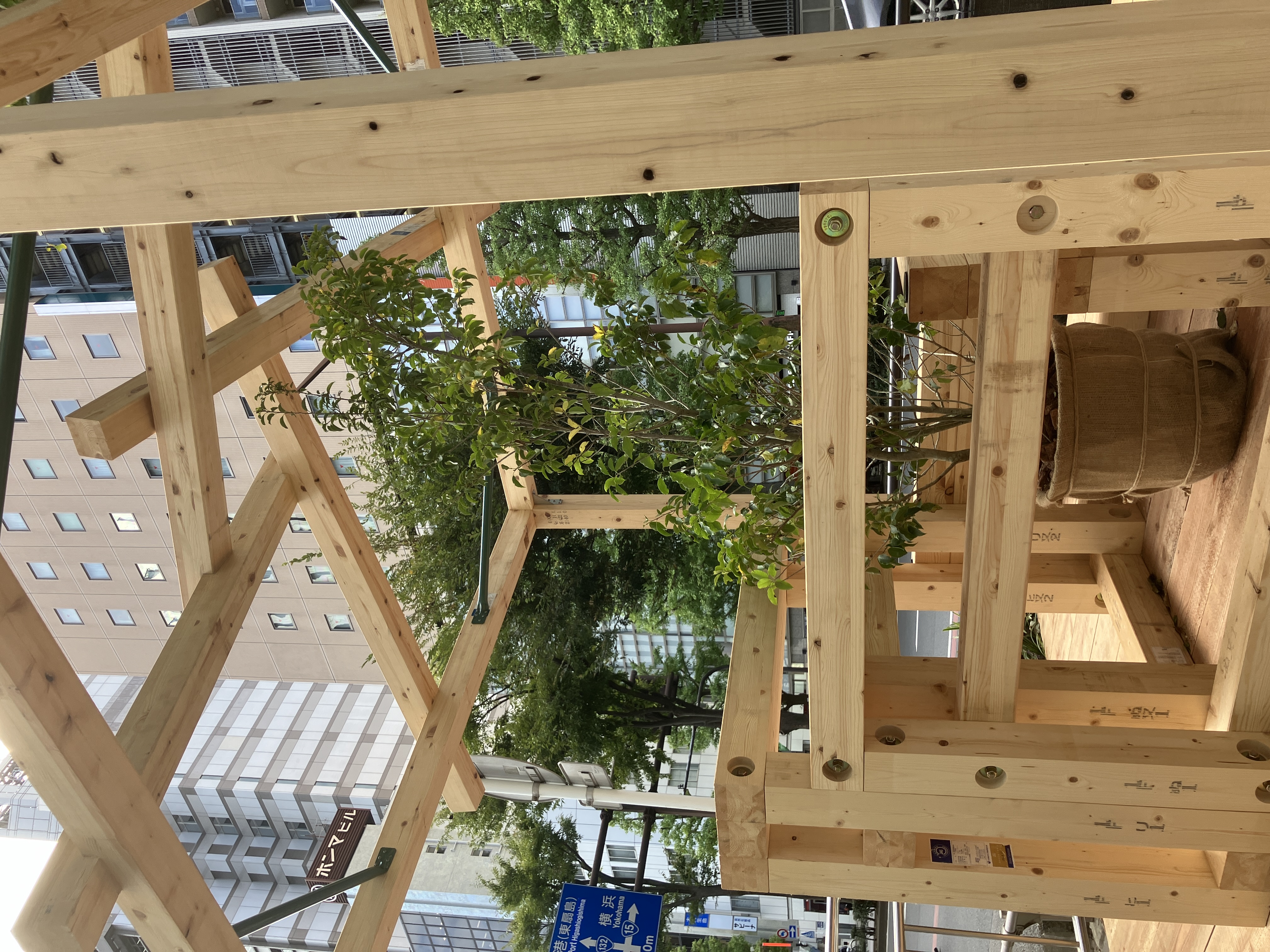 2024年7月1日に市制100周年を迎えた川崎市。「全国都市緑化かわさきフェア」の一環として、神奈川県川崎駅前市役所通りの歩道の一部を”かわさきパークレット”スペースとして開放し、その中に国産材を使用した休憩所『しかくい軒』が設置されています。屋根を支える4本の梁は、お互いが支える納まりとなっており、中央部に柱を設けることなく傾斜を実現しています。