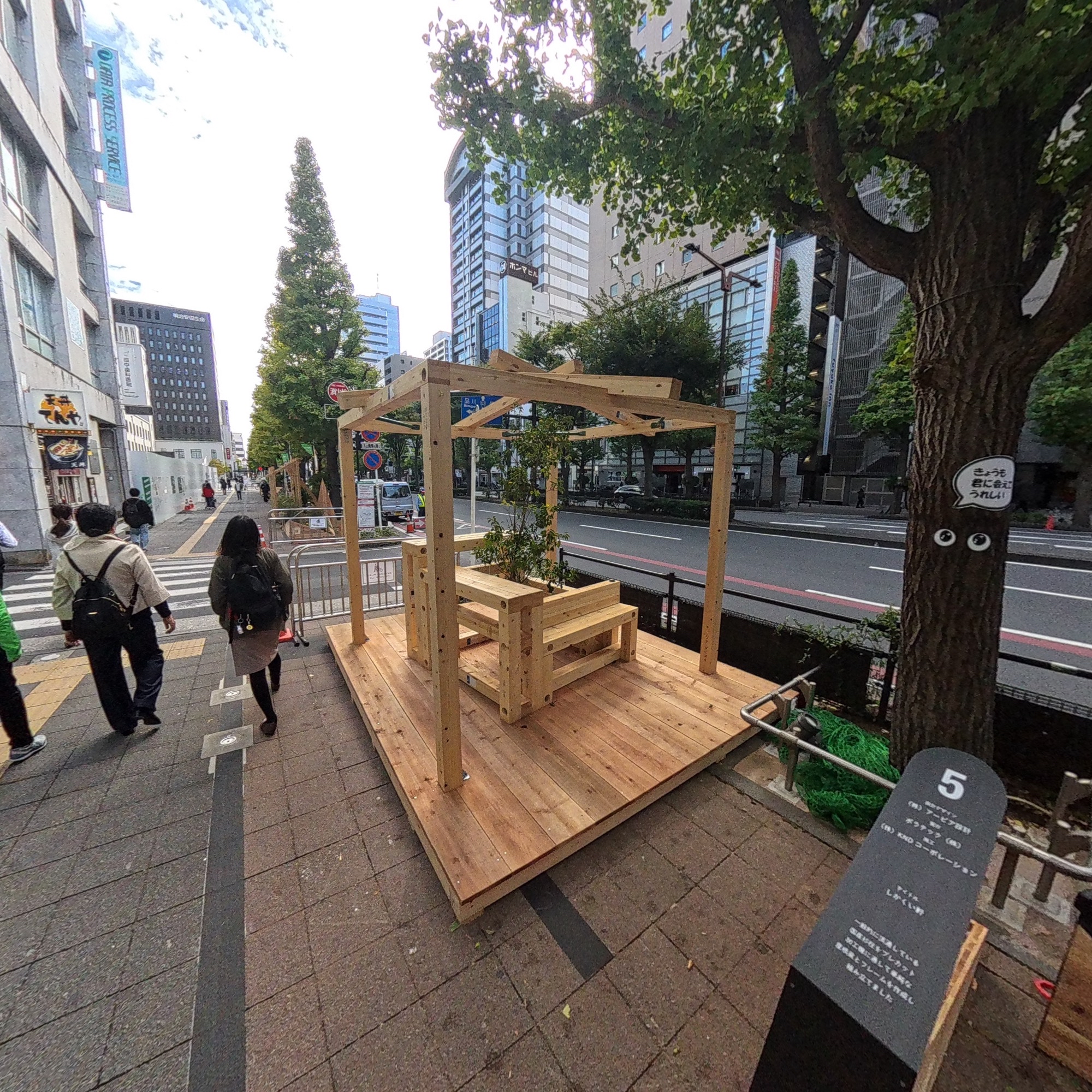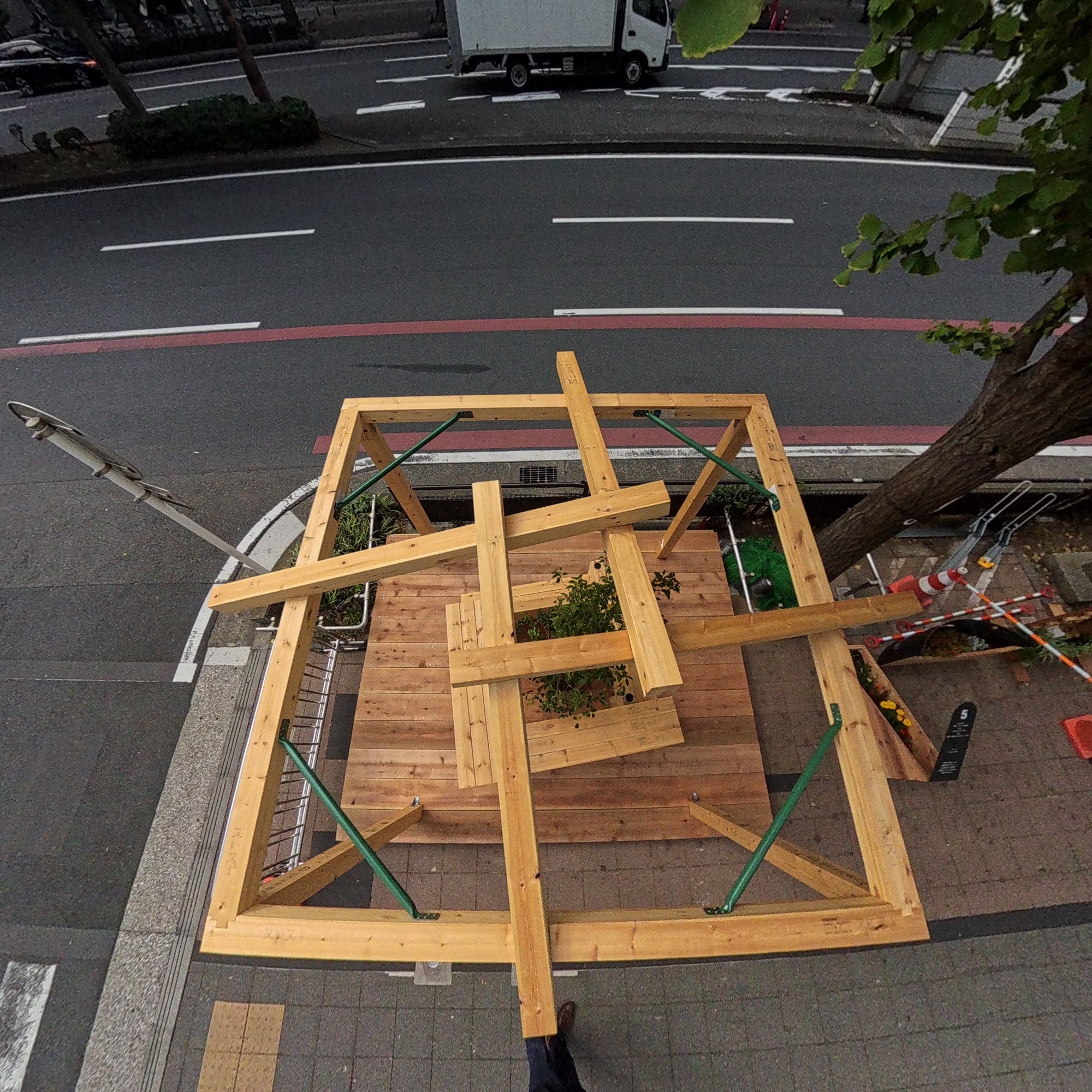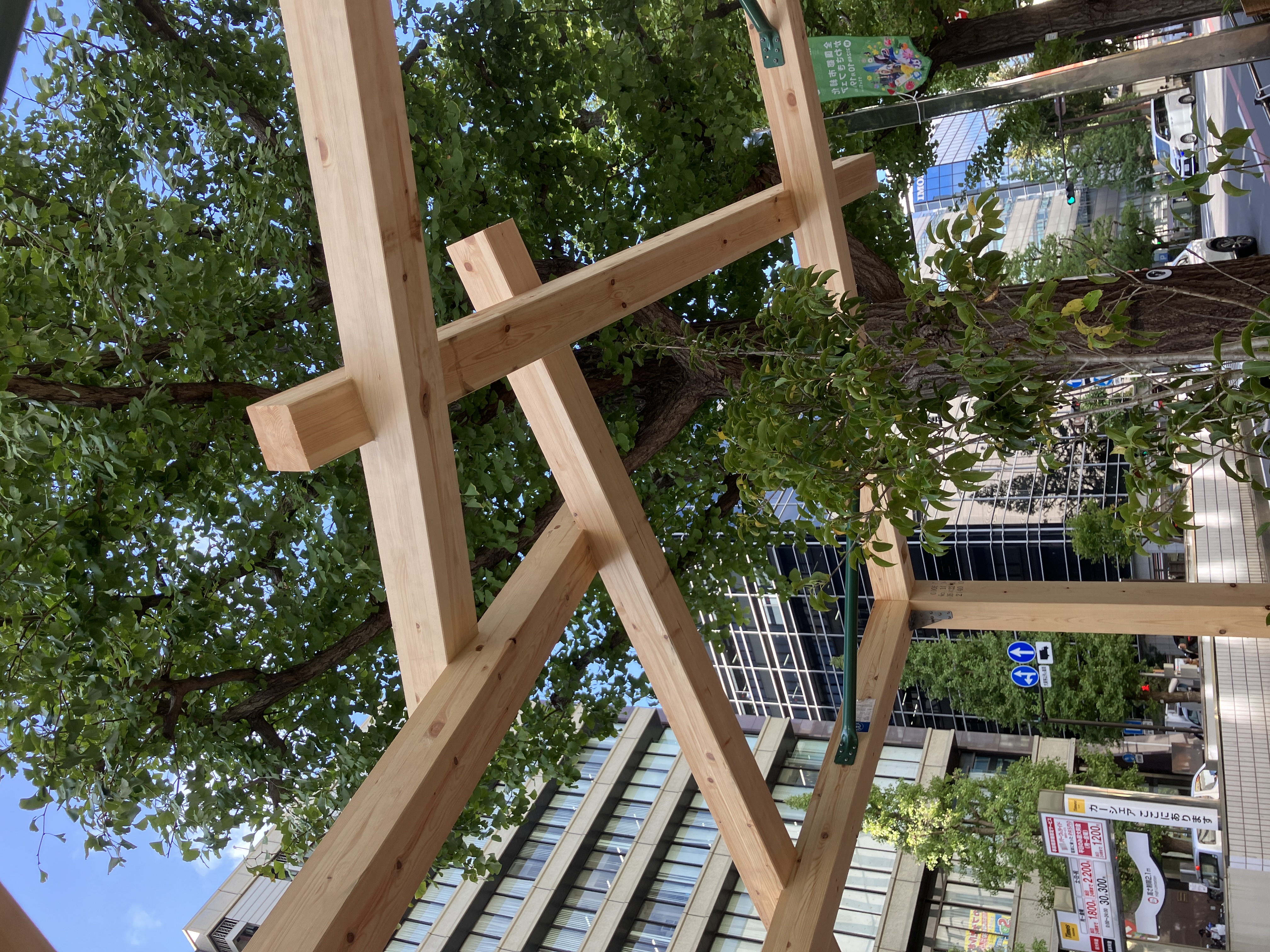 2024年7月1日に市制100周年を迎えた川崎市。「全国都市緑化かわさきフェア」の一環として、神奈川県川崎駅前市役所通りの歩道の一部を”かわさきパークレット”スペースとして開放し、その中に国産材を使用した休憩所『しかくい軒』が設置されています。屋根を支える4本の梁は、お互いが支える納まりとなっており、中央部に柱を設けることなく傾斜を実現しています。